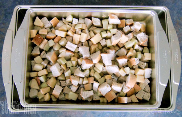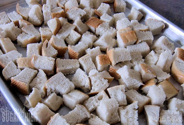 Getting things started you’ll want to preheat the oven to 350 degrees F and a day before you will be making this, cut a loaf of Italian bread into large cubes. Let the cubes dry out overnight on a cookie sheet.