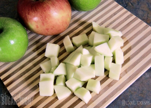 While the bread crumbs are soaking, cut 2 green apples and 1 fuji apple into 1/2 inch cubes.