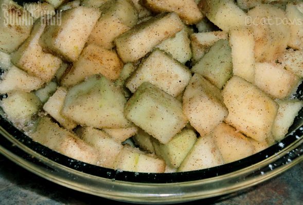 Toss the apples in 1/2 TBS of apple pie spice and 1/2 cup of white sugar.