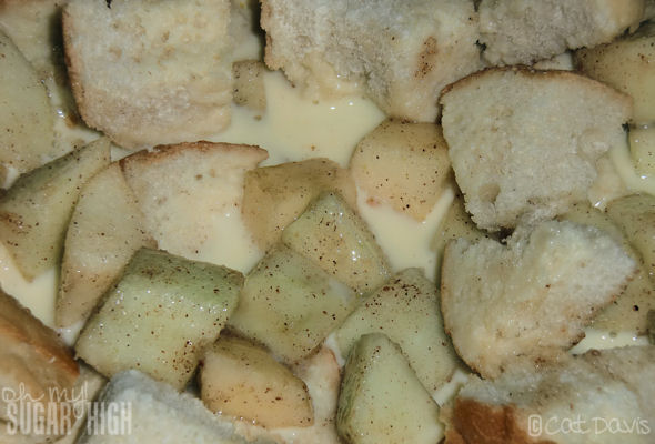 Mix the apples into the bread and custard mixture.