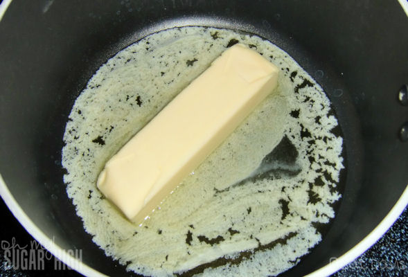 Next we’ll make the sweet, Spiced Amaretto glaze by melting 1 stick of butter over medium heat.