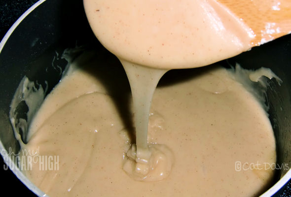 Add 1/8 of a cup of Amaretto liquer, 1/2 tsp apple pie spice and 1 1/2 cups of powdered sugar until well mixed.