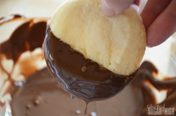 After dipping cookies in chocolate, run the back of the cookie off the side of the bowl to remove excess and create a smooth bottom.