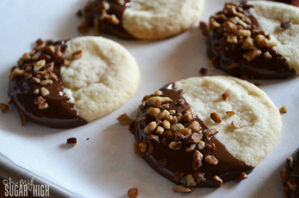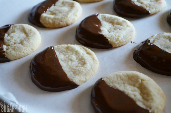 5. Dip cooled sugar cookie into melted chocolate at an angle to cover 1 /3 of the cookie. Gently shake off excess chocolate into bowl. Place on wax paper (or parchment paper) to dry.