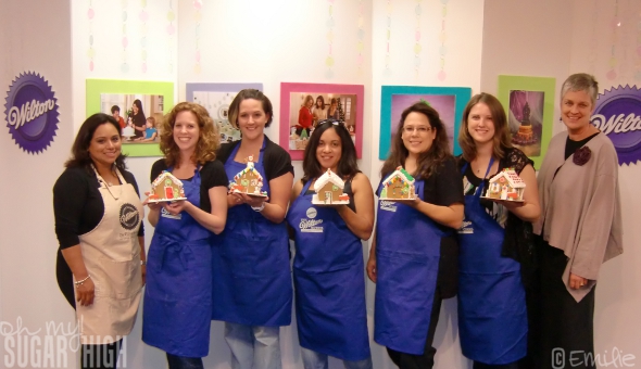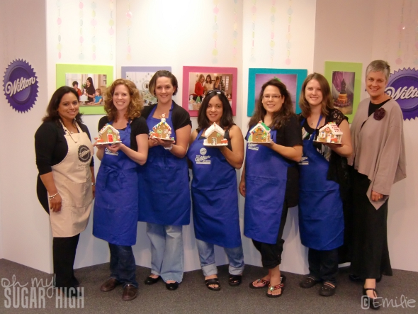 (Wilton Mom Ambassadors in blue aprons from left to right: Shannon from The Mommy Files, Tanya from Mommy Goggles, Caryn from Rockin’ Mama, Lori from A Cowboy’s Wife/My Wooden Spoon and Emilie (me) from Baby Loving Mama/Oh My! Sugar High)
