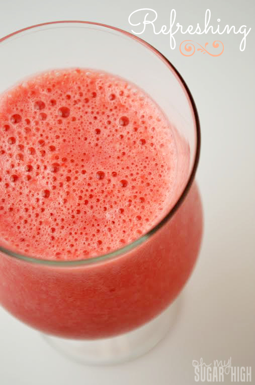 In a blender, mix together all ingredients until well blended. If you are using frozen strawberries you will need to thaw them slightly before blending so you won’t have any large pieces in your drink. Pour in a glass and enjoy!