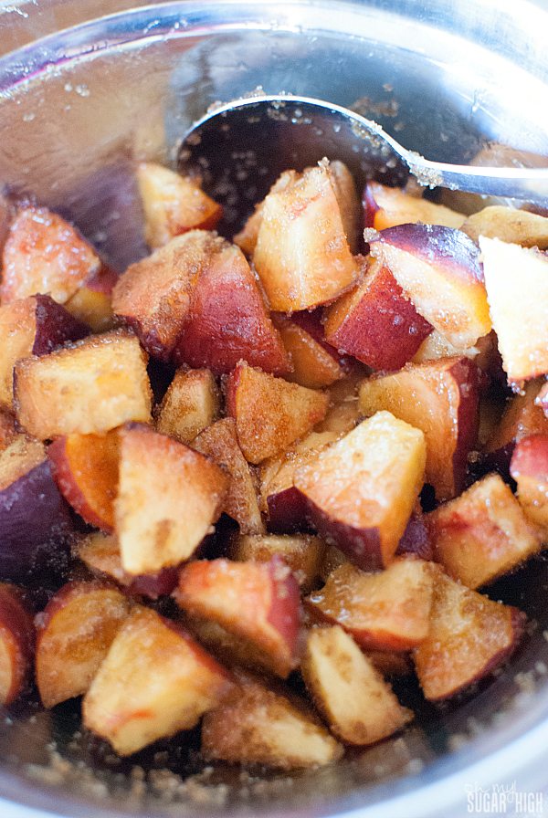 Sprinkle brown sugar onto the peaches and mix thoroughly. Set aside.