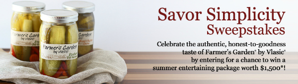 Farmer’s Garden by Vlasic kicked off a program called Savor Simplicity this past May, meant to celebrate life’s simple joys and share recipes, BBQ tips and summer entertaining ideas. They share so many delicious and unique recipes! And even better, righ now they are holding a Savor Simplicity Sweepstakes, where you can enter for a chance to win a summer entertaining package valued at $1,500. As an added bonus, entering the Sweepstakes unlocks a $1 coupon for Farmer’s Garden. See full contest rules.
